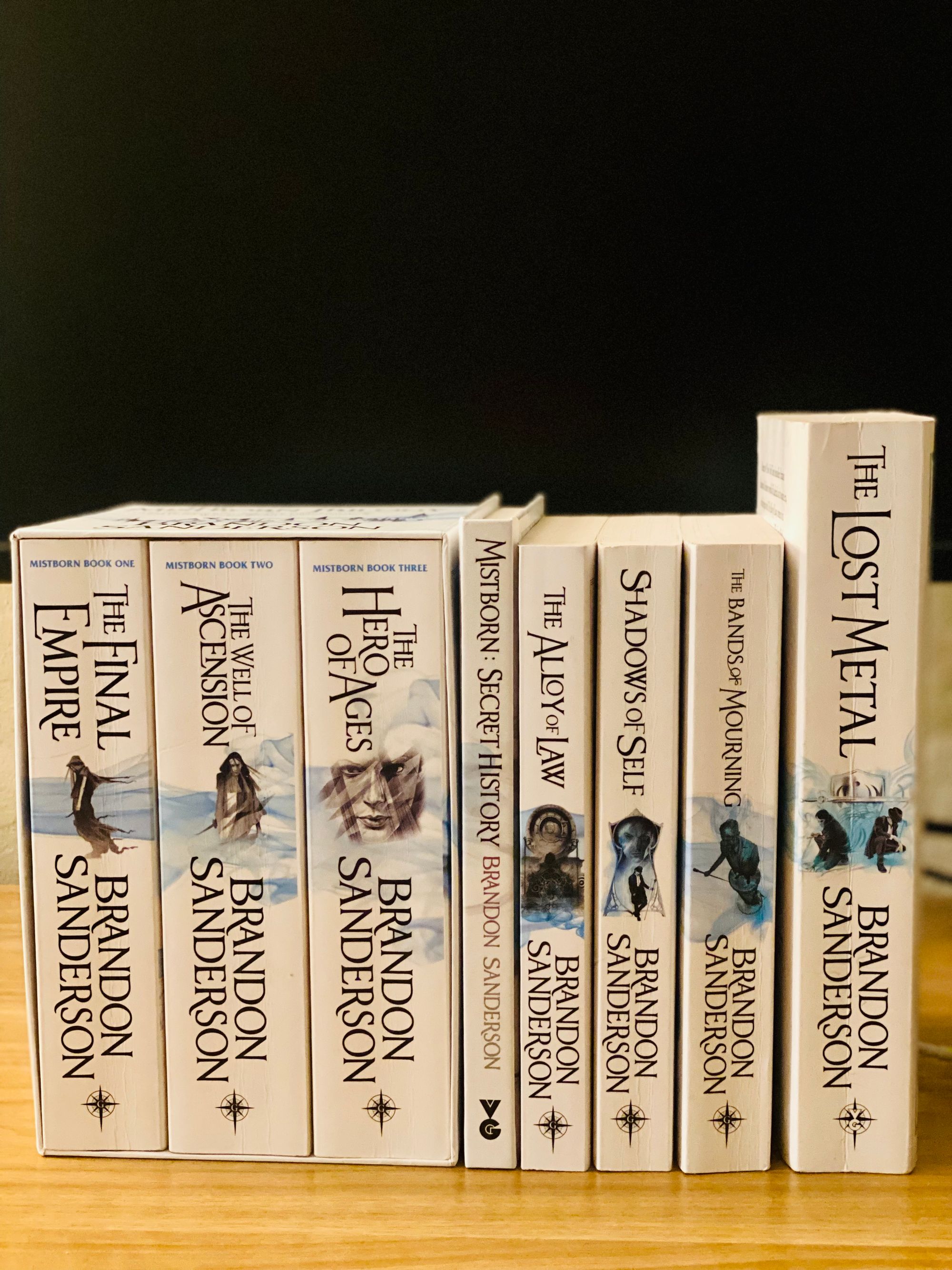Fantasy is around 80% of what I read. Once I read Elantris, Brandon Sanderson became my instant favorite. I started the Mistborn series, one of Sanderson's earlier works of his career, with the last book of the series coming the previous year. The Mistborn Series has seven books and a novella split into two eras.