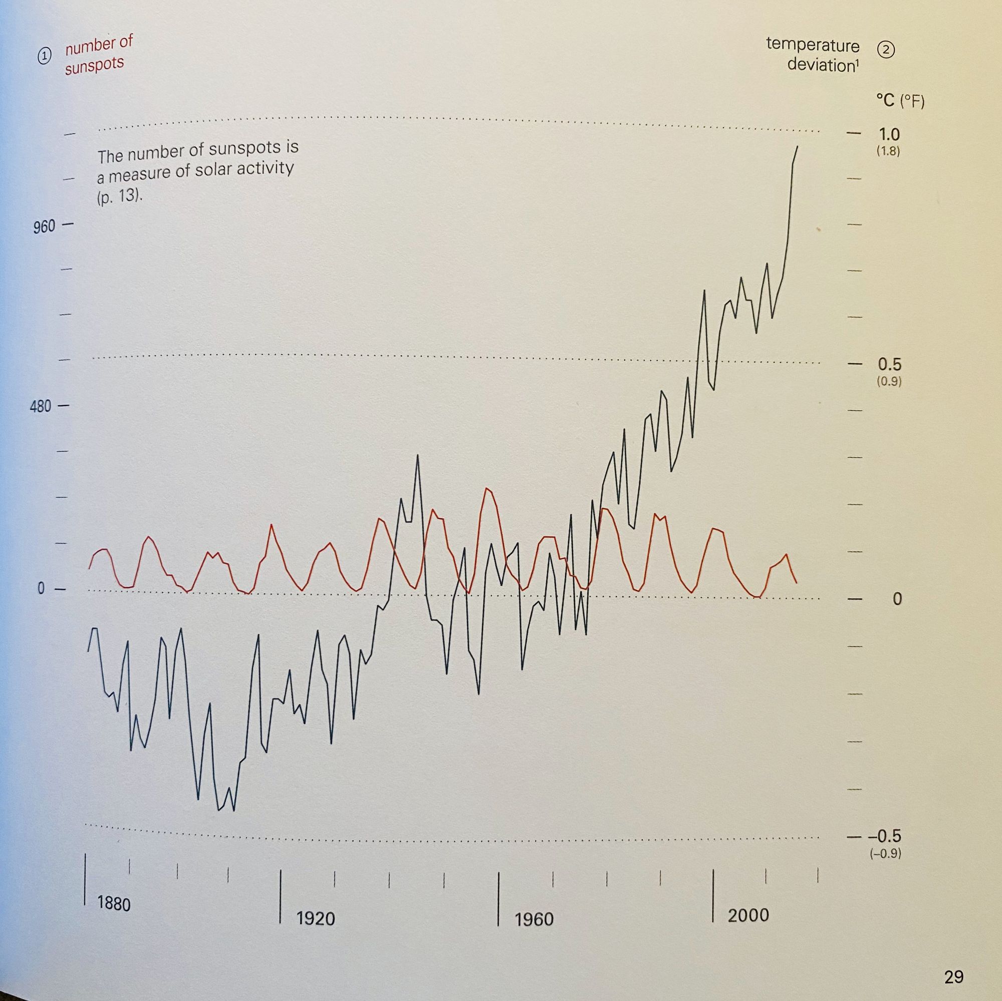 The solar activity, including the solar cycle, contributed only about 10% to the rise in temperature between 1905 and 2005. So its effect is relatively small. We cannot, therefore, attribute the sharp rise in temperature since the beginning of industrialization to solar activity.