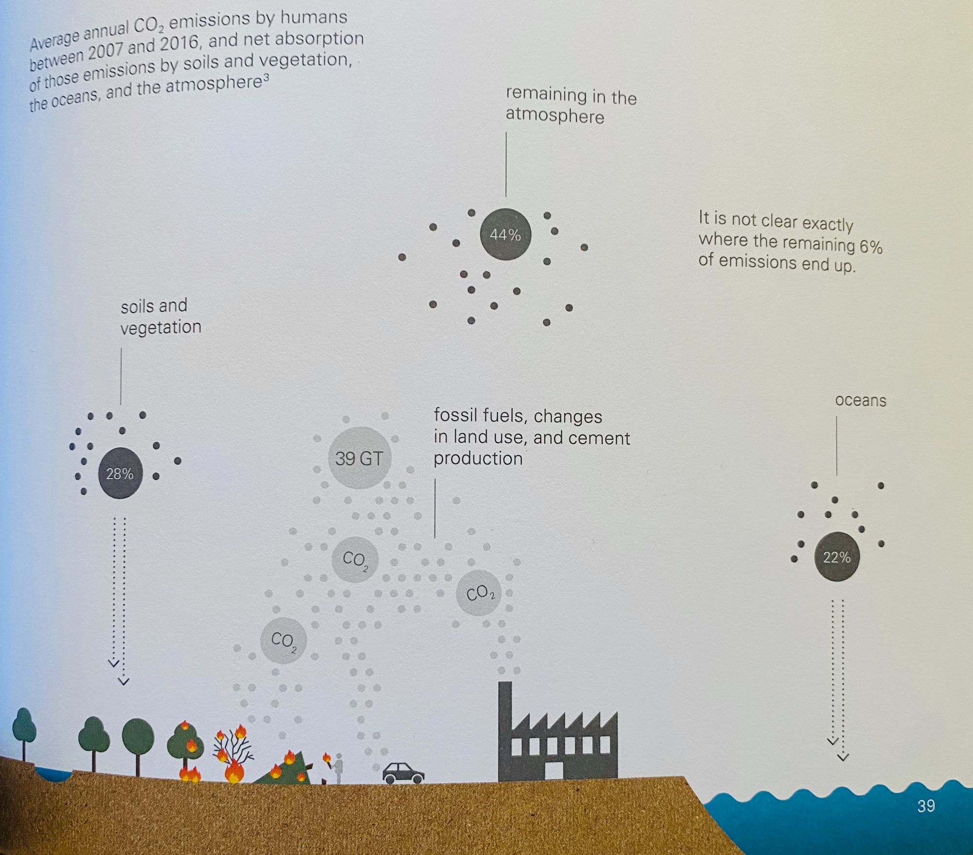 Oceans, soils, and vegetation release carbon dioxide (CO2)into the atmosphere and absorb CO2 from the atmosphere, thus forming a natural carbon cycle. Humans have released 39 gigatons (43 billion US tons) of CO2 yearly in the past ten years. Vegetation and soils absorb about 28% CO2, and the ocean absorbs about 22%, but 44% remains suspended in the atmosphere. The remaining 6% is unaccounted for. Overall, we are producing more CO2 than our planet can consume, thus affecting the carbon cycle and increasing the greenhouse effect. This sudden extra release of CO2 has also made the oceans more acidic.