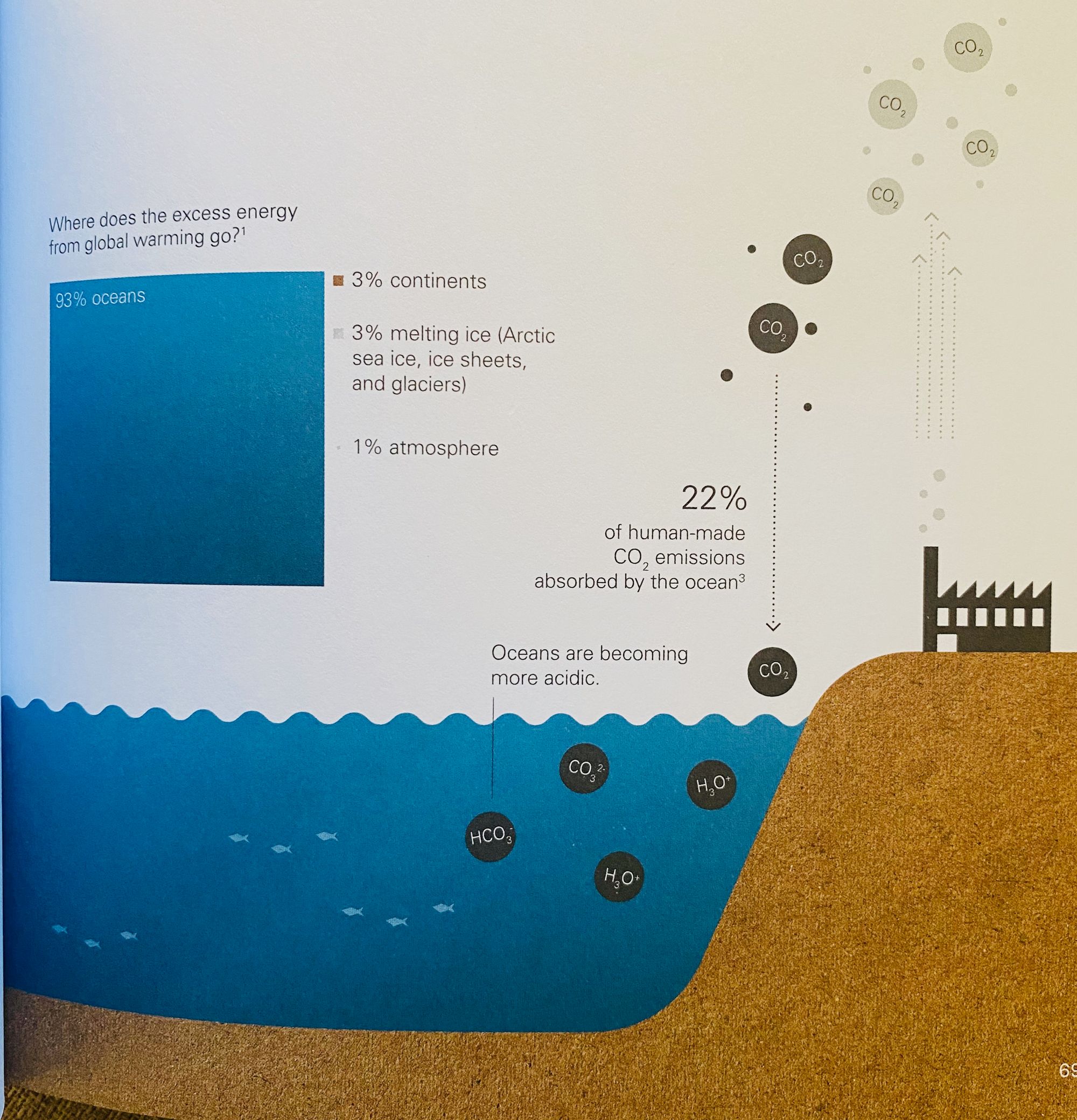 From 1971 to 2010, the oceans absorbed 93 percent of the energy kept within the Earth's atmosphere due to human-made climate change. As a result, the average surface temperature of the oceans has risen, and they are becoming more acidic due to the increasing CO2 concentrations. In this way, the oceans are attenuating global warming, but at the expense of their sea life, which is increasingly affected.