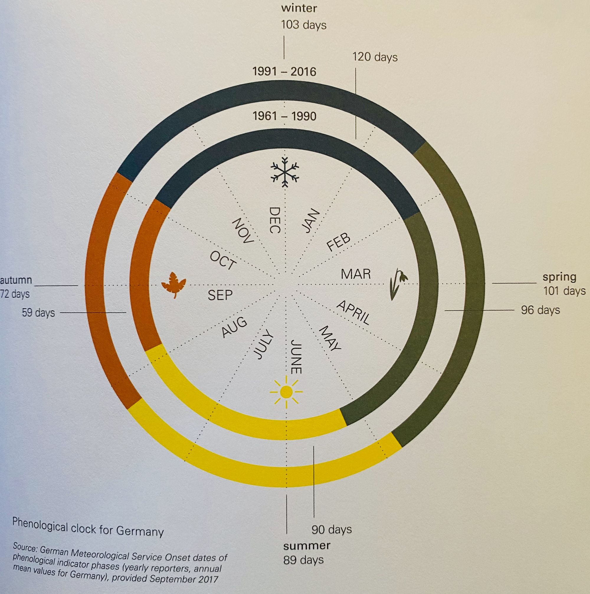 Rising temperatures result in phenological (phenology refers to the observable periodical stages in plant and animal development over a year) changes such as birds breeding earlier in the year or plants blooming earlier in the year. Over the last few decades, the phenological spring has started an average of 2.8 days earlier each decade.